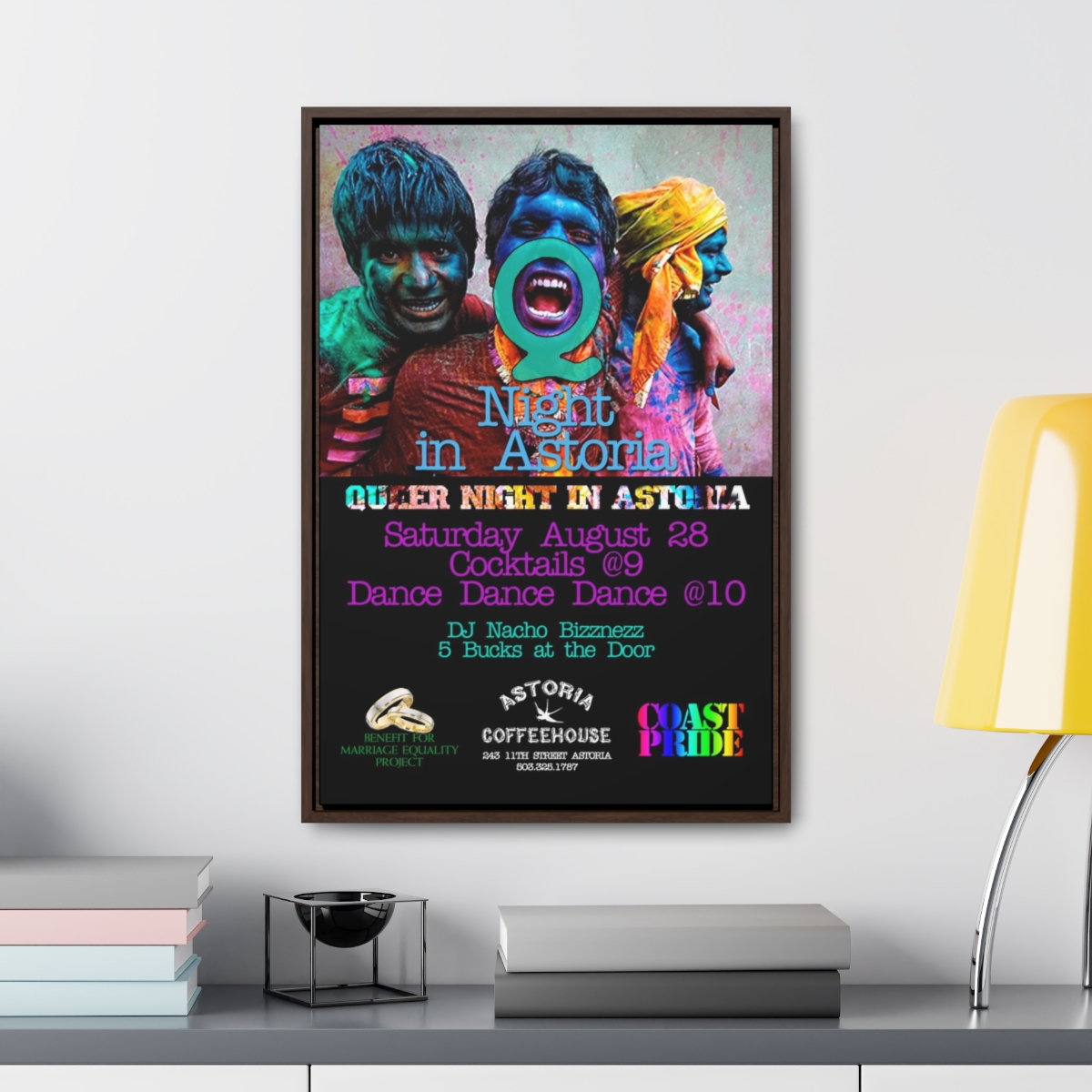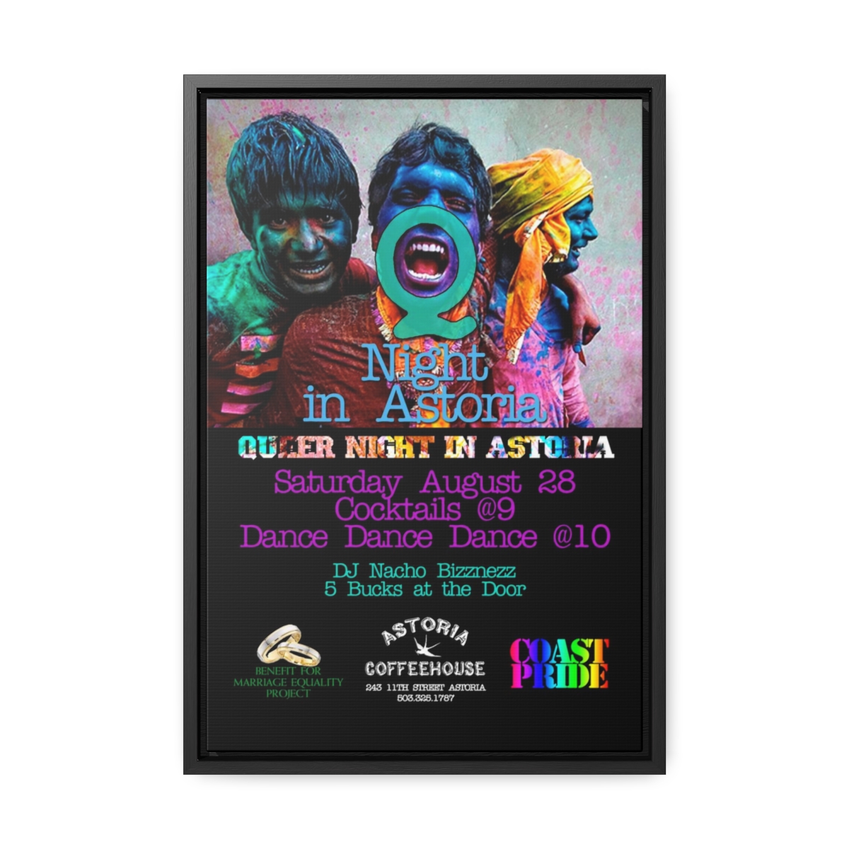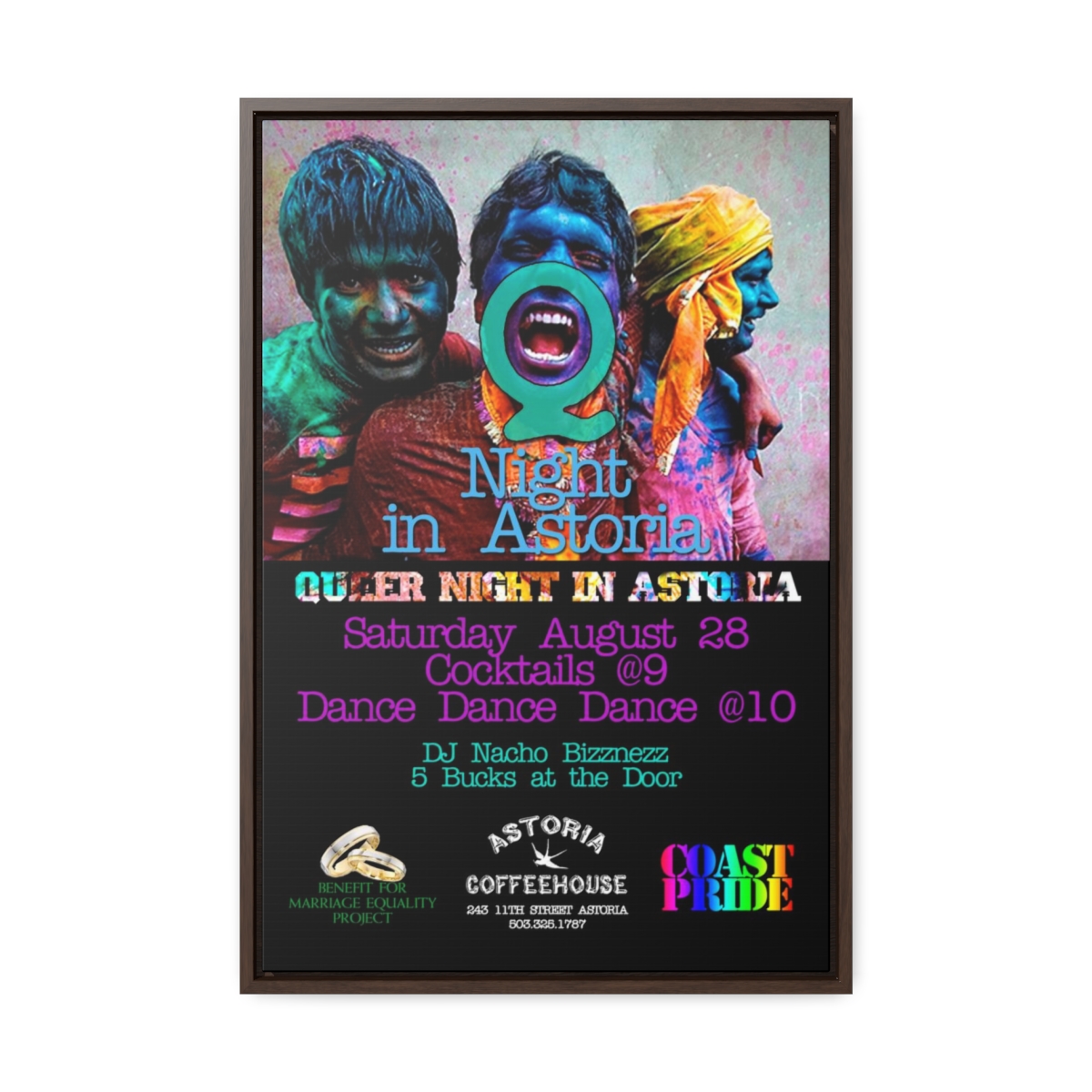 The poster for Q Night in Astoria Benefit for Marriage Equality Project held at Astoria Coffeehouse & Bistro in Astora, Oregon on August 28, 2010 created by Scott Docherty.