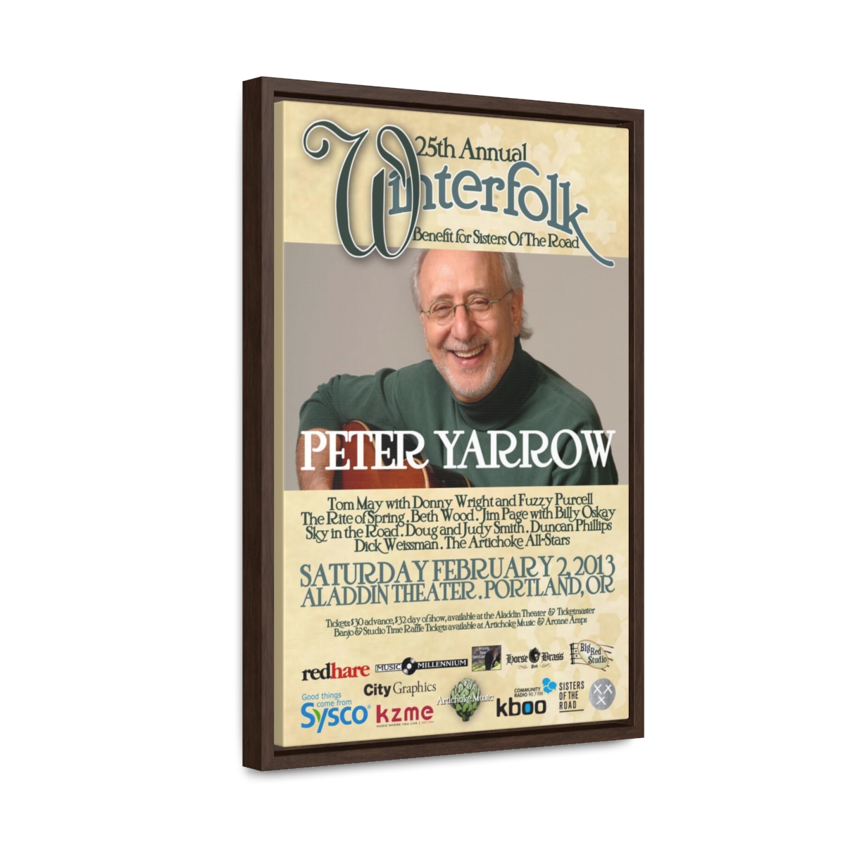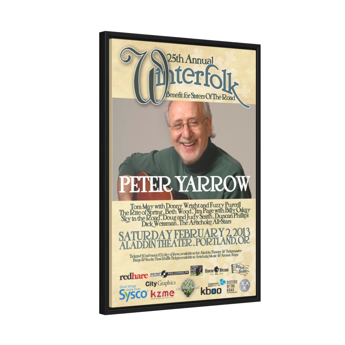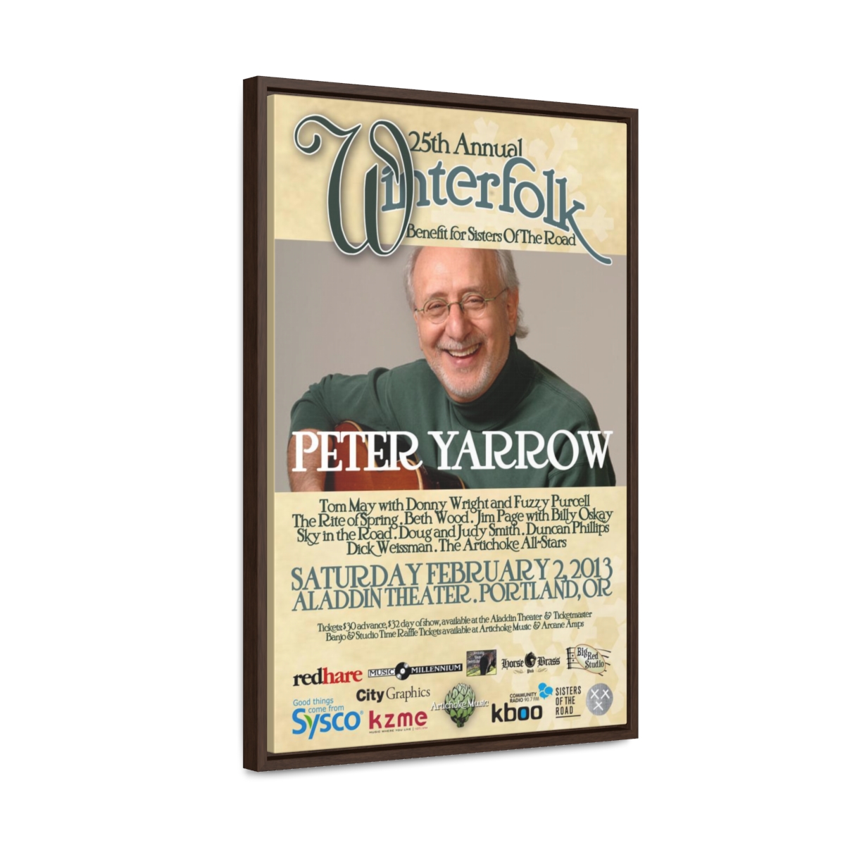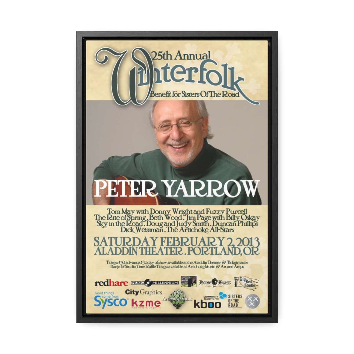 The official poster for the 25th annual Winterfolk Benefit, starring Peter Yarrow, held at the Aladdin Theater in Portland, Oregon on February 2, 2013 created by Scott Docherty.