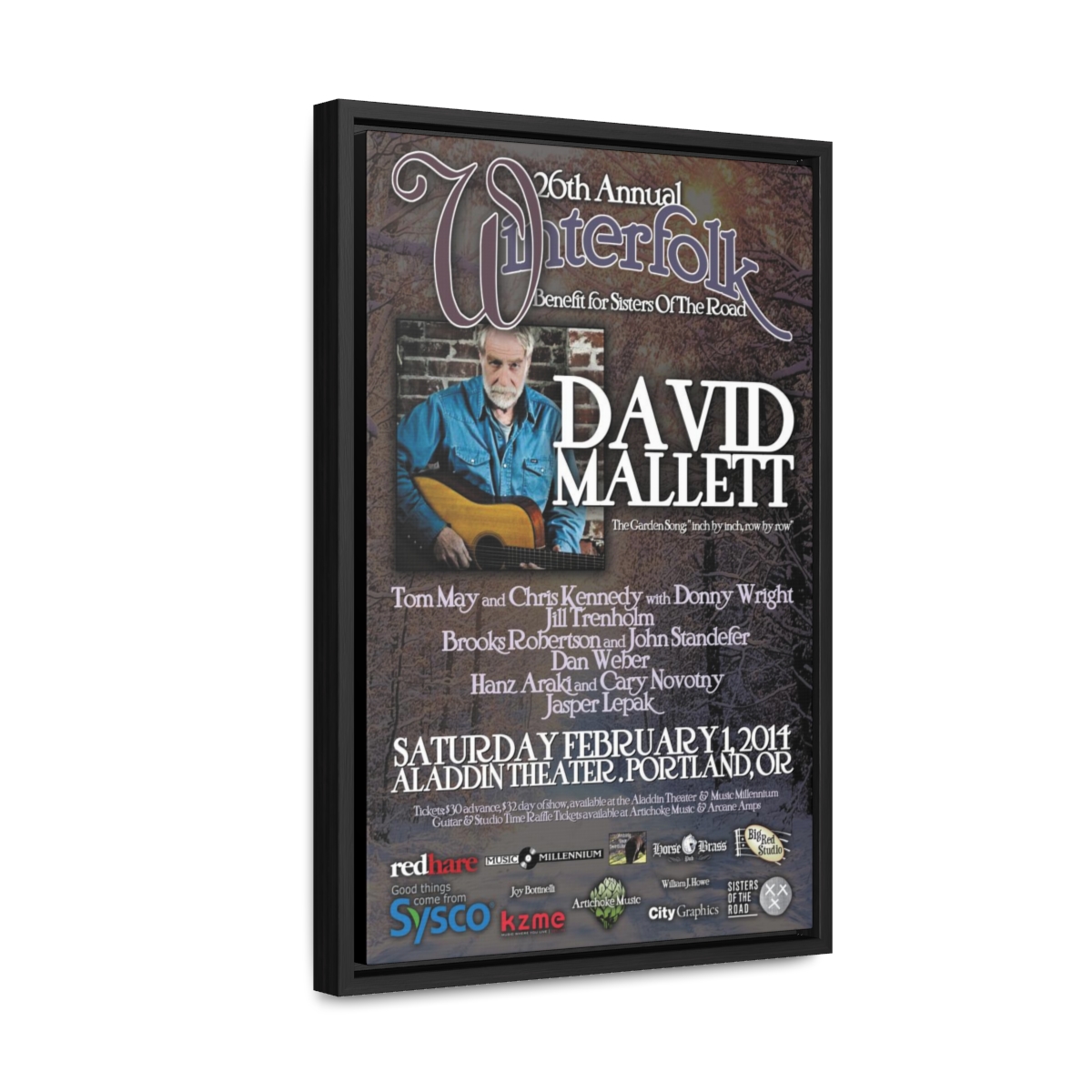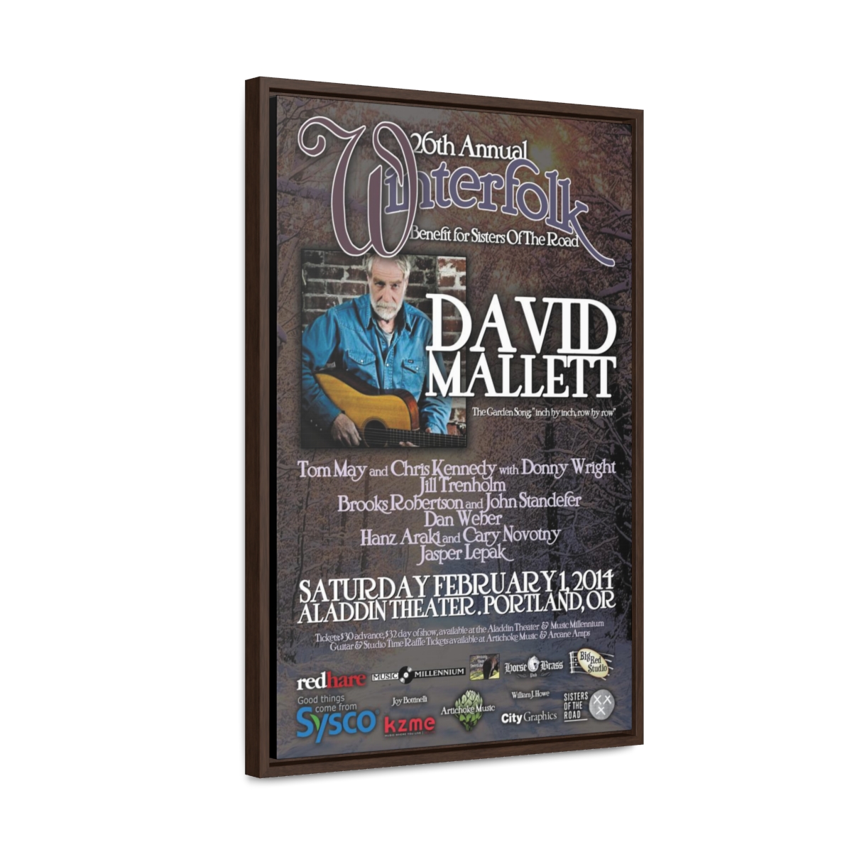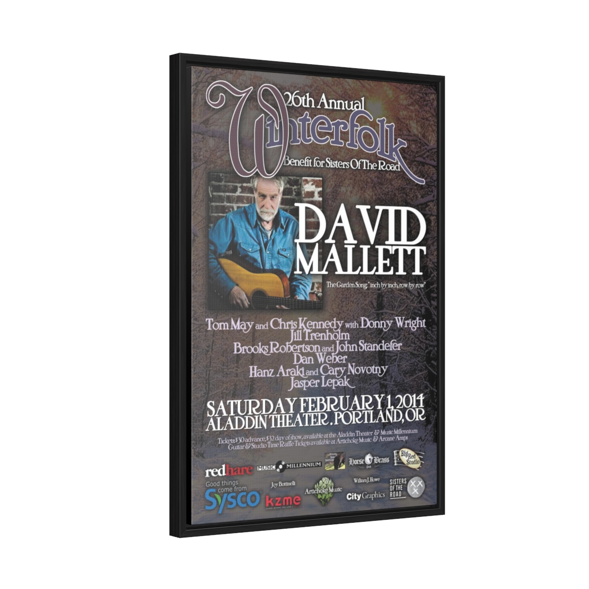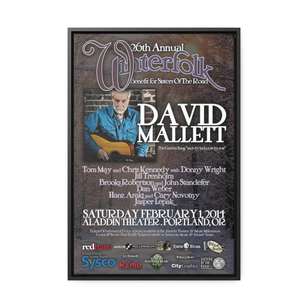 The official poster for the 26th annual Winterfolk Benefit, starring David Mallett, held at the Aladdin Theater in Portland, Oregon on February 1, 2014 created by Scott Docherty.