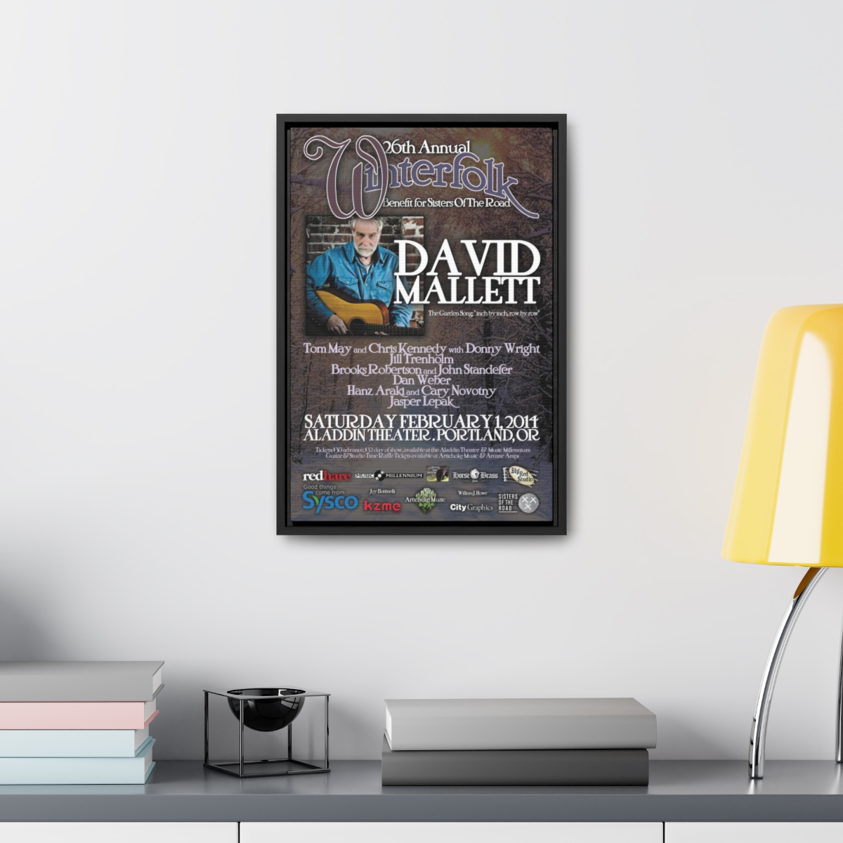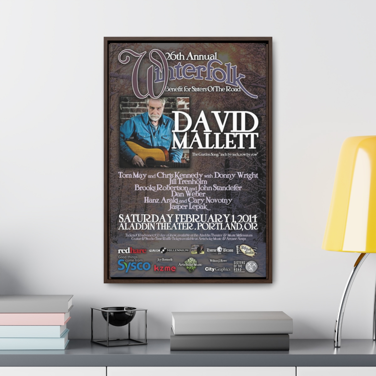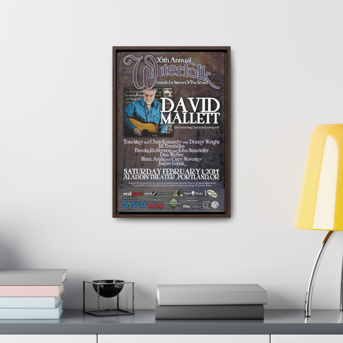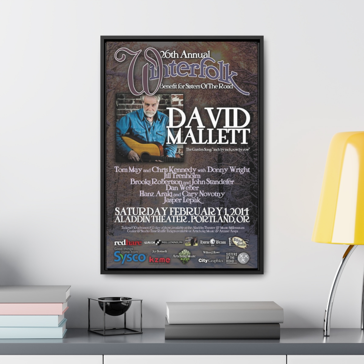The official poster for the 26th annual Winterfolk Benefit, starring David Mallett, held at the Aladdin Theater in Portland, Oregon on February 1, 2014 created by Scott Docherty.