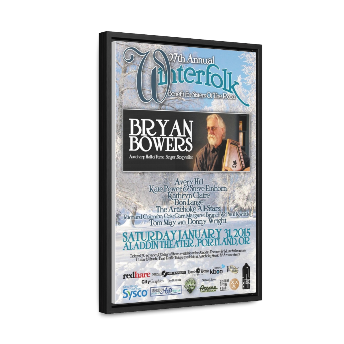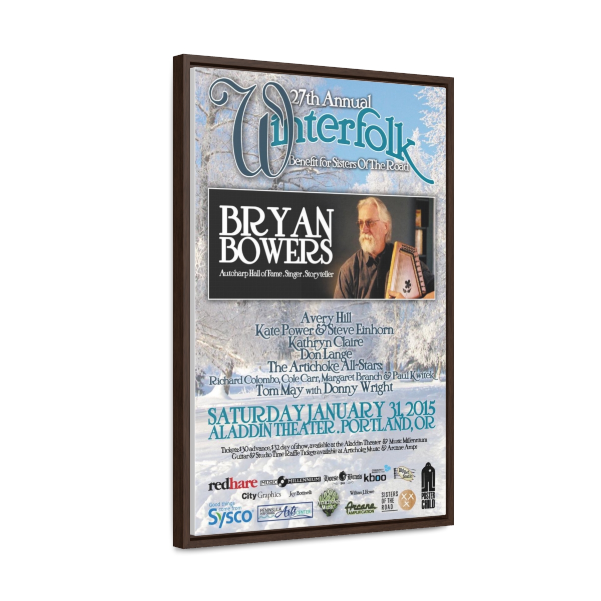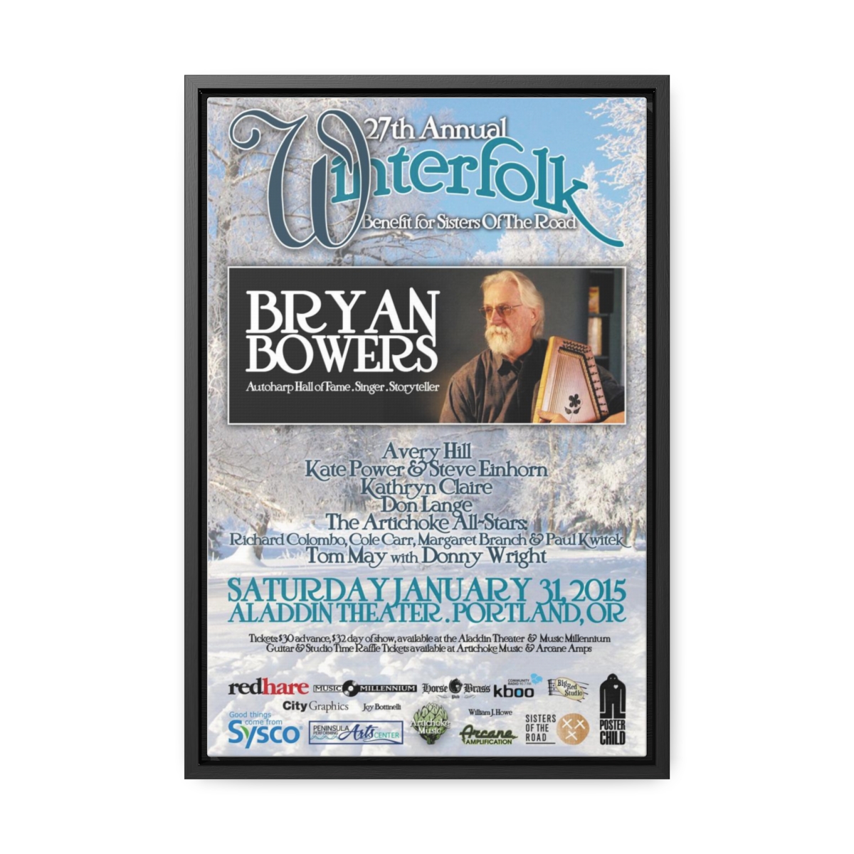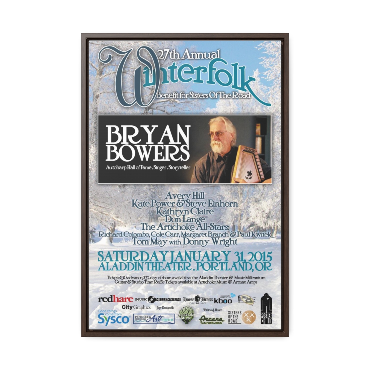 The official poster for the 27th annual Winterfolk Benefit, starring Bryan Bowers, held at the Aladdin Theater in Portland, Oregon on January 31, 2015 created by Scott Docherty.